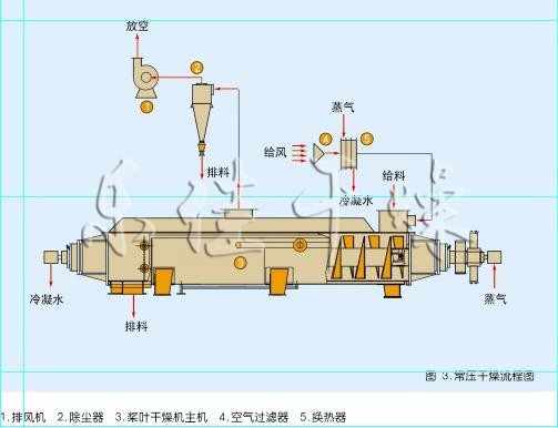 ◎浆叶干燥机能耗低: 由于间接加热,没有大量携带空气带走热量,干燥器外壁又设置保温层,对浆状物料,蒸发1kg水仅需1.2kg水蒸汽。
